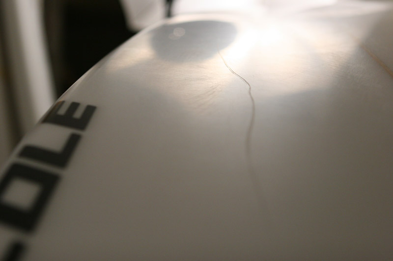 もちろんボードの性能、耐久性には全く関係のない浅いものですのでリペアの必要などは全くなしですが、光にかざしてみると、ちょっと目立ちます。