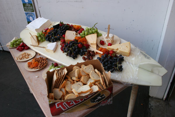 サーフボードの上に盛り付けられたおつまみ。チーズがおいしかった。