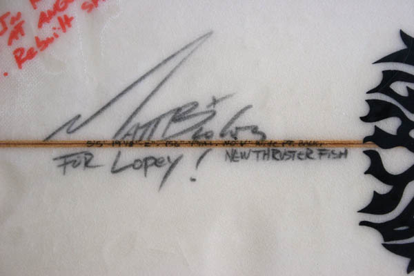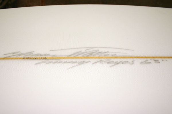 それにしてもデッキ、ボトムともボコボコ、ノーズから1/3あたりのところで半分折れたのを修理した跡もありました。よっぽど気に入って乗っていたんですね。