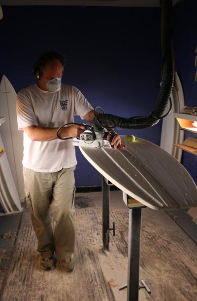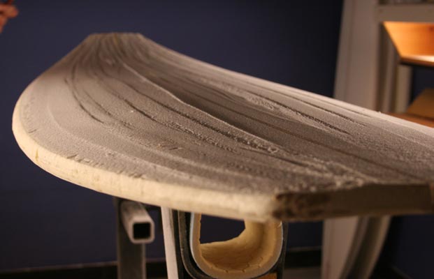 ナキサーフ限定、パドル激速コールZENモデルのシェイプ風景を撮影してきました。この写真は最初の削りだしの場面ですが、何も手を加えられていないブランクスがこのように姿を変えていきます。