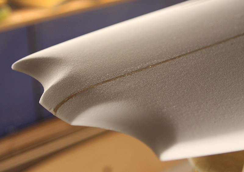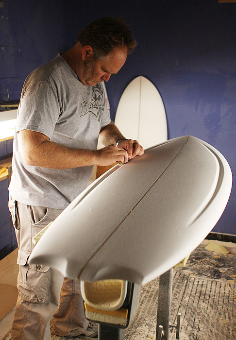 細かなレイル形状やコンケイブ、フィン位置など、マシンでは表現することのできない感覚的な部分を仕上げていきます。