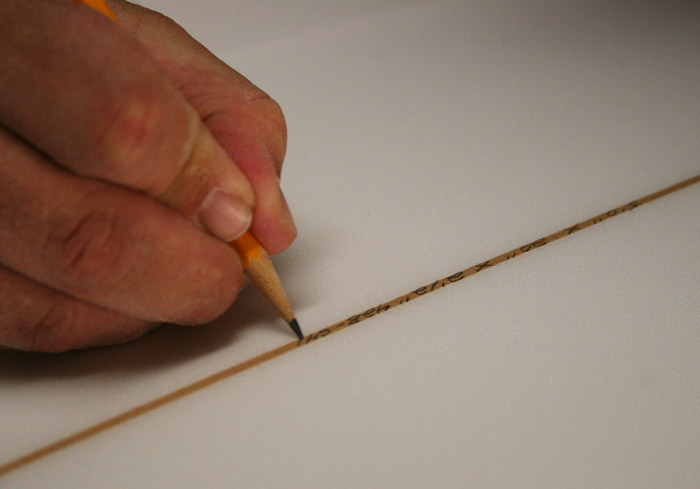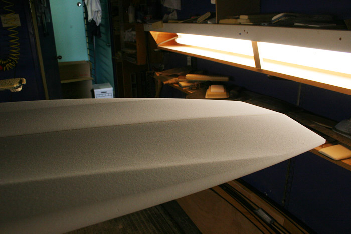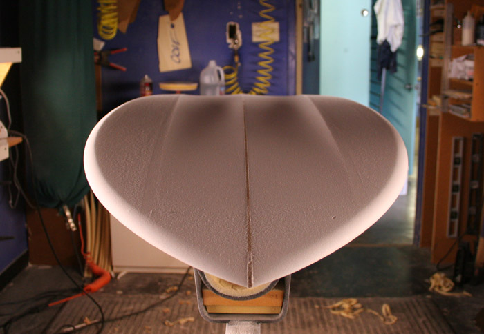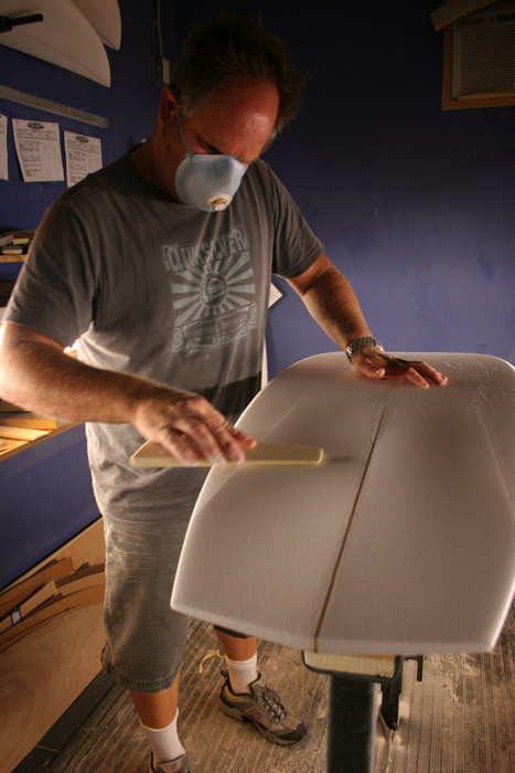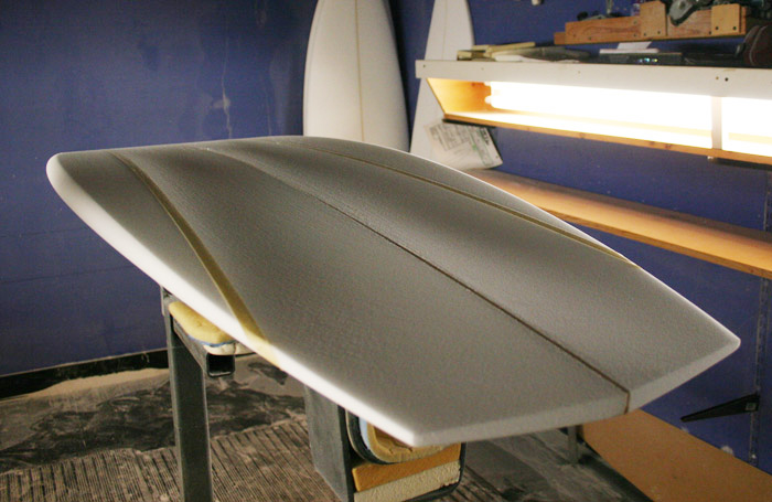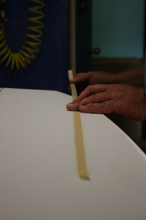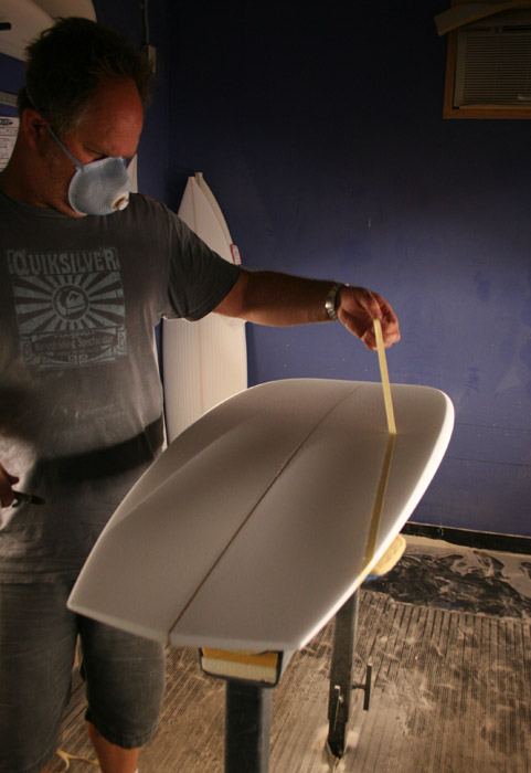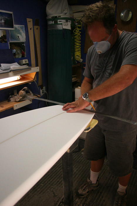大まかなアウトラインをシェイプし終えたブランクスに、まずはフィン位置を設定。