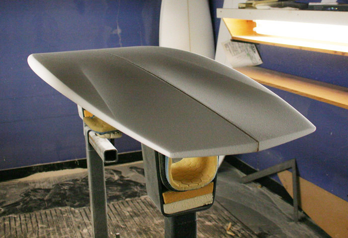 最初のプロトモデルからの進化版である船木のマジックボード、ブラックダイヤモンド2でシェイプとしての完成をみたこのボードですが、コールがさらに進化版の実験的デザインをロボ用にシェイプ!