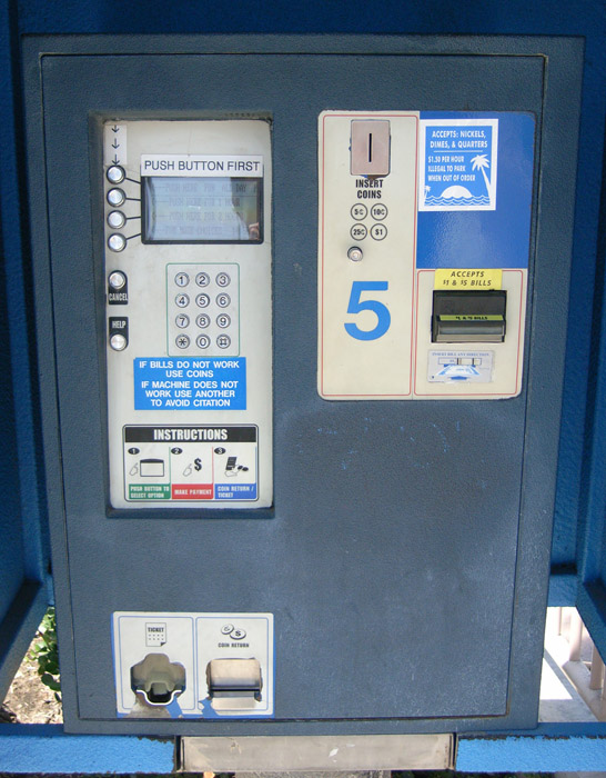 ビーチへのアクセスも最高の条件のピアの両側にある駐車上には、こんなブルーの自販機が…。